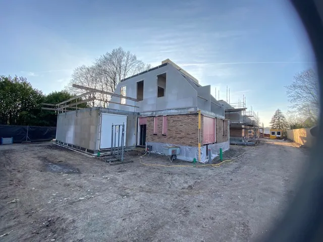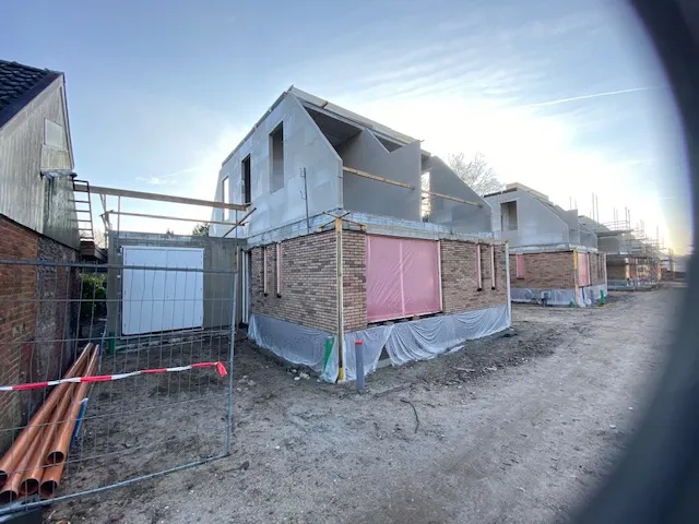 20 januari 2025 is gestart met het aanbrengen van kapconstructie. De dakvloeren liggen er bij alle 4 woningen op en het gevelmetselwerk is gereed en de afbouw is gestart.
